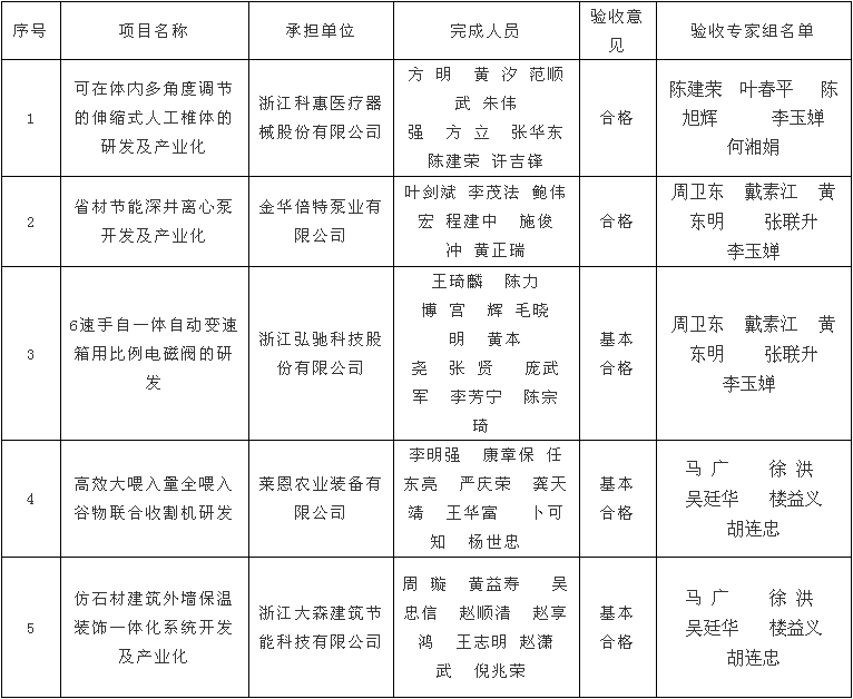 根據(jù)《金華市級科技計劃項目驗收管理辦法》(金市科字〔2015〕83號)規(guī)定,現(xiàn)將浙江科惠醫(yī)療器械股份有限公司、金華倍特泵業(yè)有限公司、浙江弘馳科技股份有限公司、萊恩農(nóng)業(yè)裝備有限公司、浙江大森建筑節(jié)能科技有限公司承擔的《可在體內(nèi)多角度調(diào)節(jié)的伸縮式人工椎體的研發(fā)及產(chǎn)業(yè)化》、《省材節(jié)能深井離心泵開發(fā)及產(chǎn)業(yè)化》、《6速手自一體自動變速箱用比例電磁閥的研發(fā)》、《高效大喂入量全喂入谷物聯(lián)合收割機研發(fā)》、《仿石材建筑外墻保溫裝飾一體化系統(tǒng)開發(fā)及產(chǎn)業(yè)化》5個市級科技計劃項目驗收結(jié)果予以公示,接受社會監(jiān)督,公示期從2017年9月26日至10月8日止。任何單位和個人對驗收意見持有異議的,應當在公示期內(nèi)書面向市科技局提出異議,單位應采用書面形式并加蓋公章,個人應采用實名提出異議。
