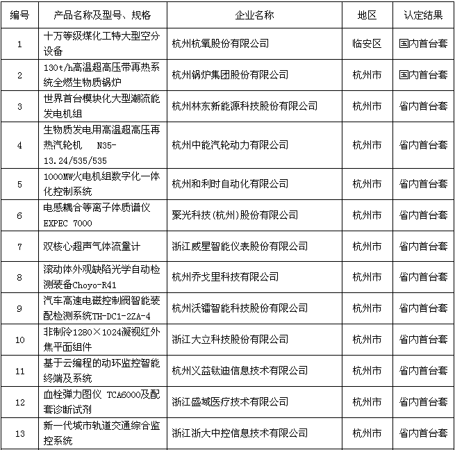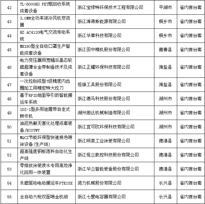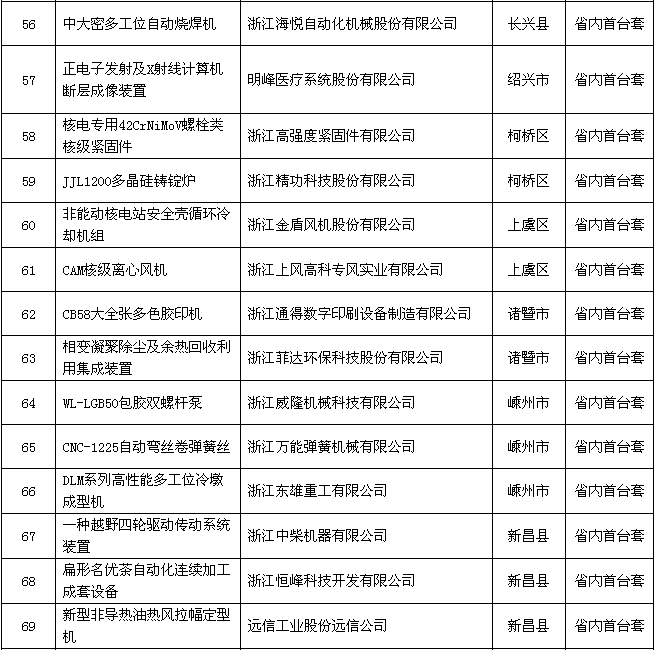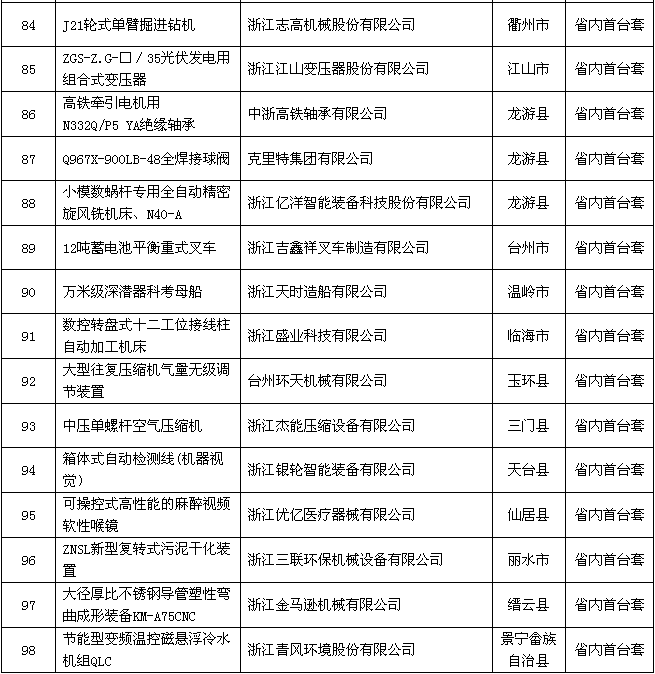 2018年度浙江省裝備制造業(yè)重點領域首臺(套)產(chǎn)品認定結果公示名單