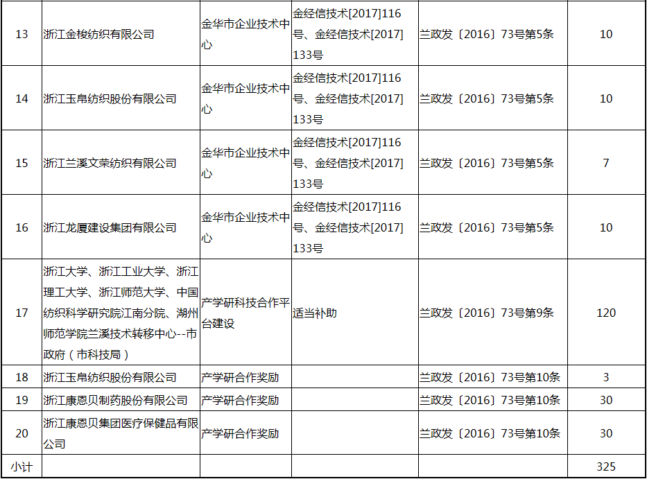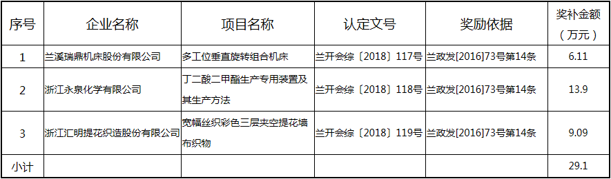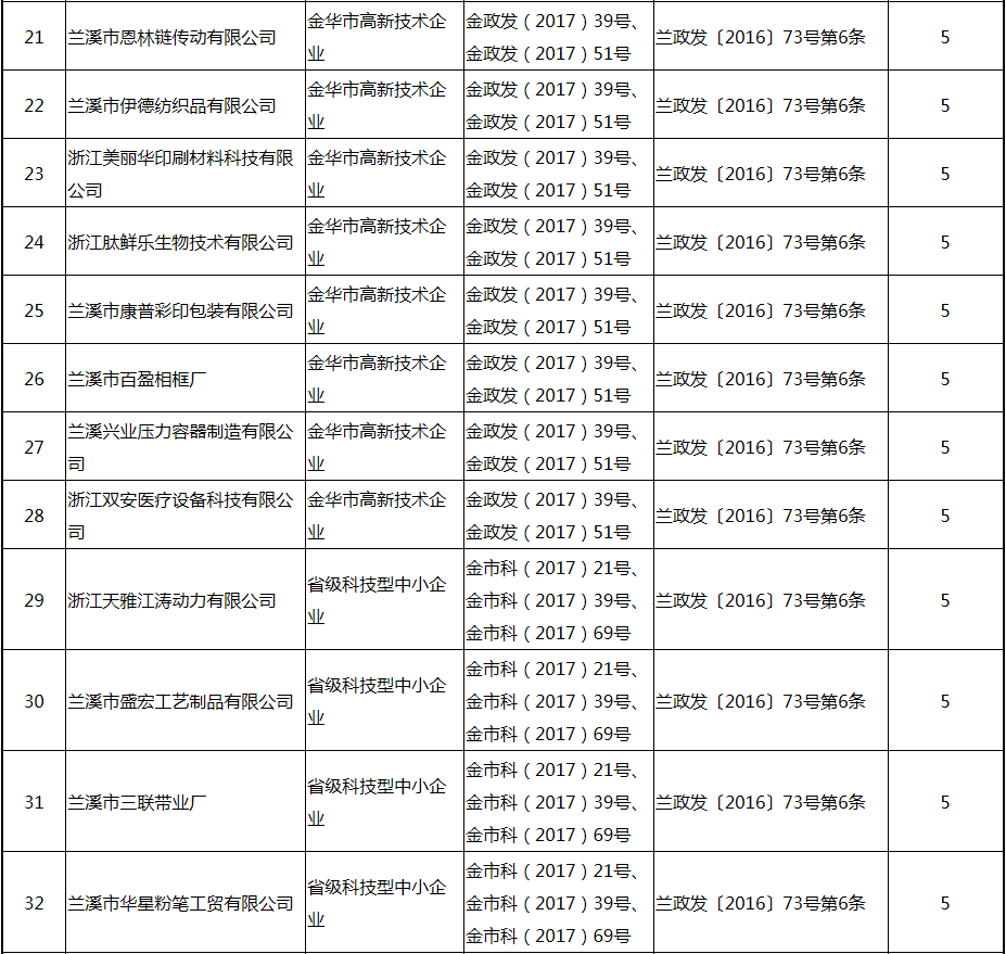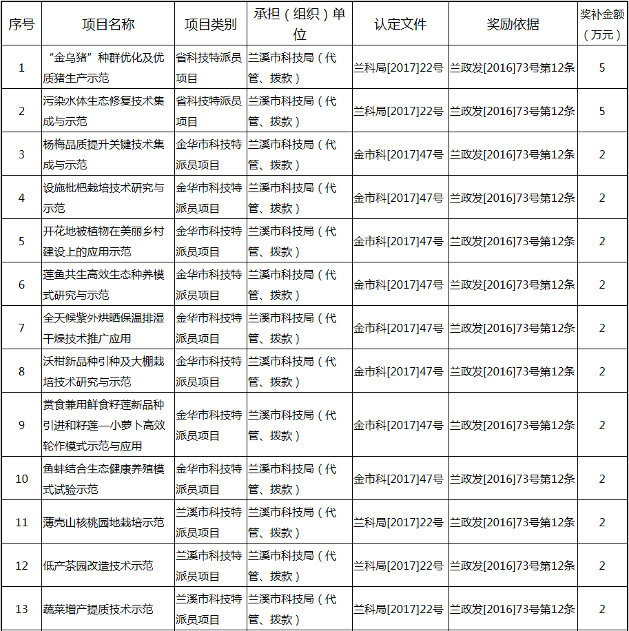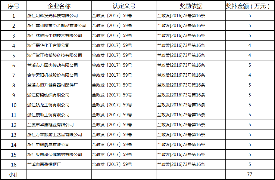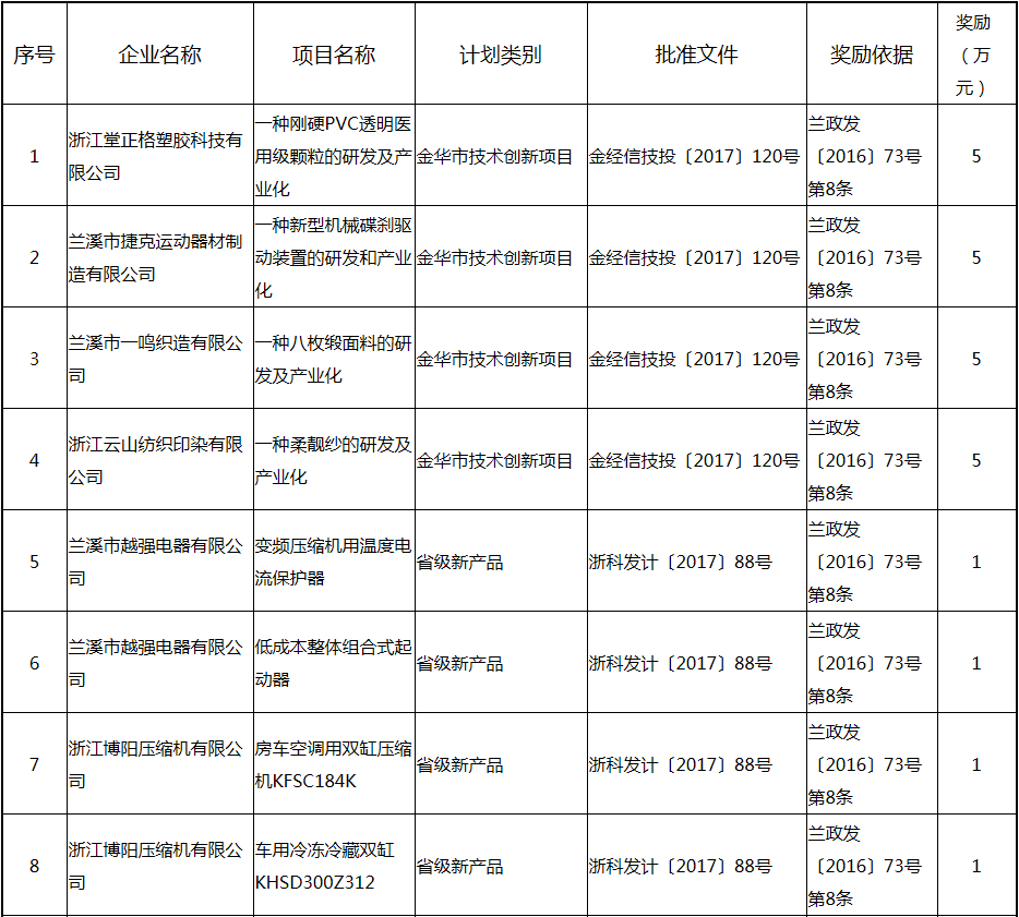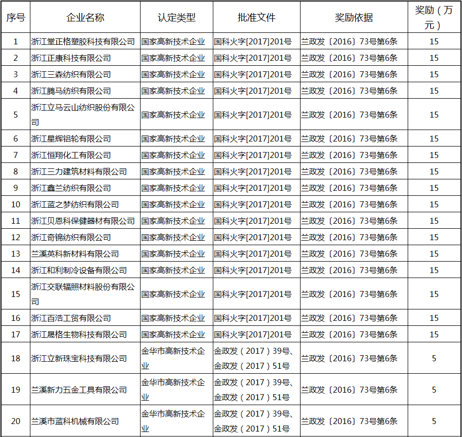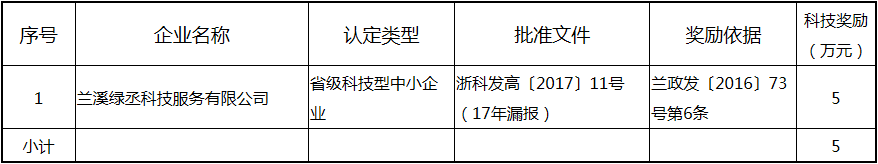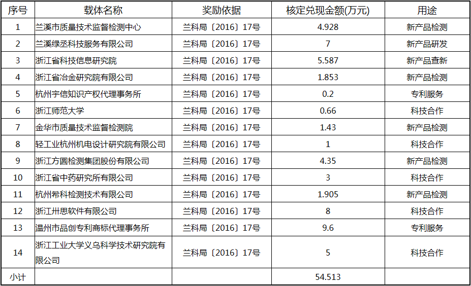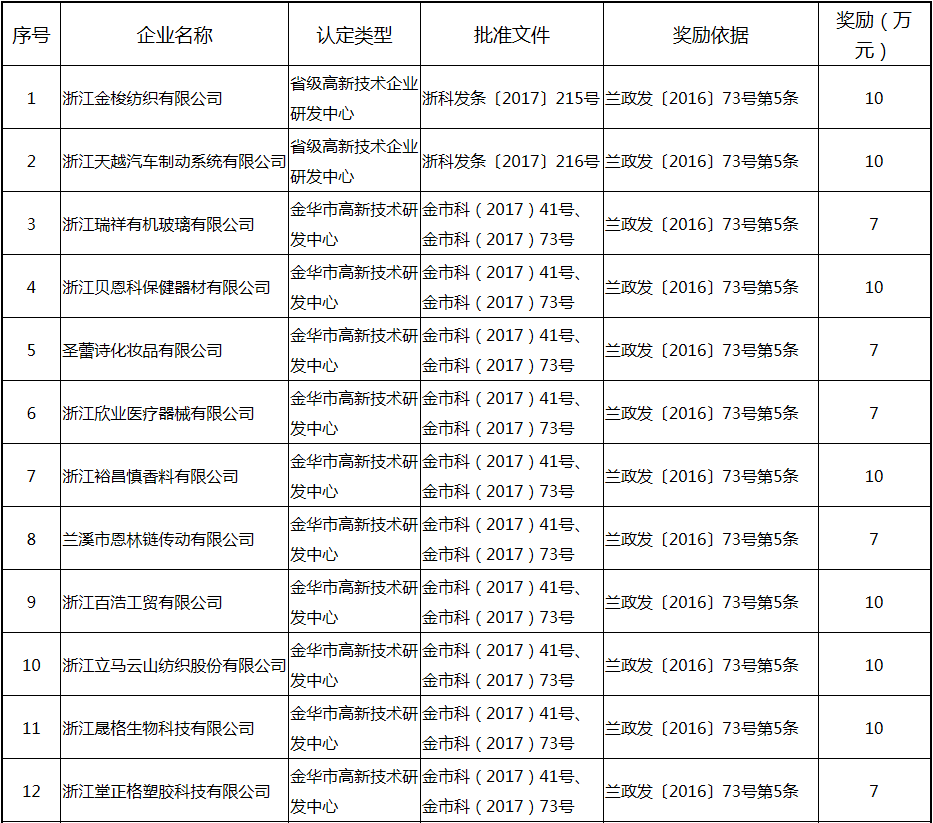 根據(jù)《關(guān)于實(shí)施創(chuàng)新驅(qū)動戰(zhàn)略大力推進(jìn)大眾創(chuàng)業(yè)萬眾創(chuàng)新的若干意見》(蘭政發(fā)〔2016〕73號)和《蘭溪市科技創(chuàng)新券實(shí)施管理辦法》(蘭科局〔2016〕17號)等文件精神,現(xiàn)將2017年度科技創(chuàng)新專項(xiàng)資金獎勵(lì)及補(bǔ)助方案予以公示,公示期五個(gè)工作日,自2018年 7月3日至 7月9日。公示期內(nèi),如對公示擬補(bǔ)助對象有疑議的,請及時(shí)向市科技局辦公室反映。