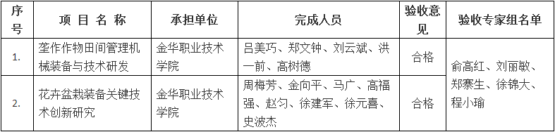 根據(jù)《金華市級科技計(jì)劃項(xiàng)目驗(yàn)收管理辦法》(金市科字〔2015〕83號)規(guī)定,現(xiàn)將金華職業(yè)技術(shù)學(xué)院承擔(dān)的《壟作作物田間管理機(jī)械裝備與技術(shù)研發(fā)》等市級科技計(jì)劃項(xiàng)目驗(yàn)收結(jié)果予以公示,接受社會監(jiān)督,公示期從2018年7月23日至2018年7月29日止。任何單位和個人對驗(yàn)收意見持有異議的,應(yīng)當(dāng)在公示期內(nèi)書面向市科技局提出異議,單位應(yīng)采用書面形式并加蓋公章,個人應(yīng)采用實(shí)名提出異議。