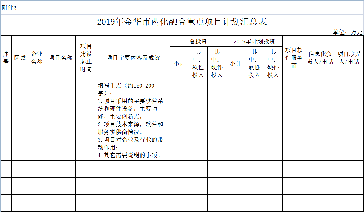 (三)請各地認(rèn)真組織,動(dòng)員企業(yè)積極申報(bào)。由申報(bào)企業(yè)按《金華市信息化和工業(yè)化融合重點(diǎn)項(xiàng)目管理辦法》要求填報(bào)《2019年金華市兩化融合重點(diǎn)項(xiàng)目申報(bào)表》(附件1)和《2019年金華市兩化融合重點(diǎn)項(xiàng)目計(jì)劃匯總表》(附件2),連同有關(guān)資料裝訂成冊(雙面打?。?;由各地經(jīng)信部門匯總《2019年金華市兩化融合重點(diǎn)項(xiàng)目計(jì)劃匯總表》(附件2)。書面申報(bào)材料二份(另需提供電子文檔),于5月30日前報(bào)送我局。