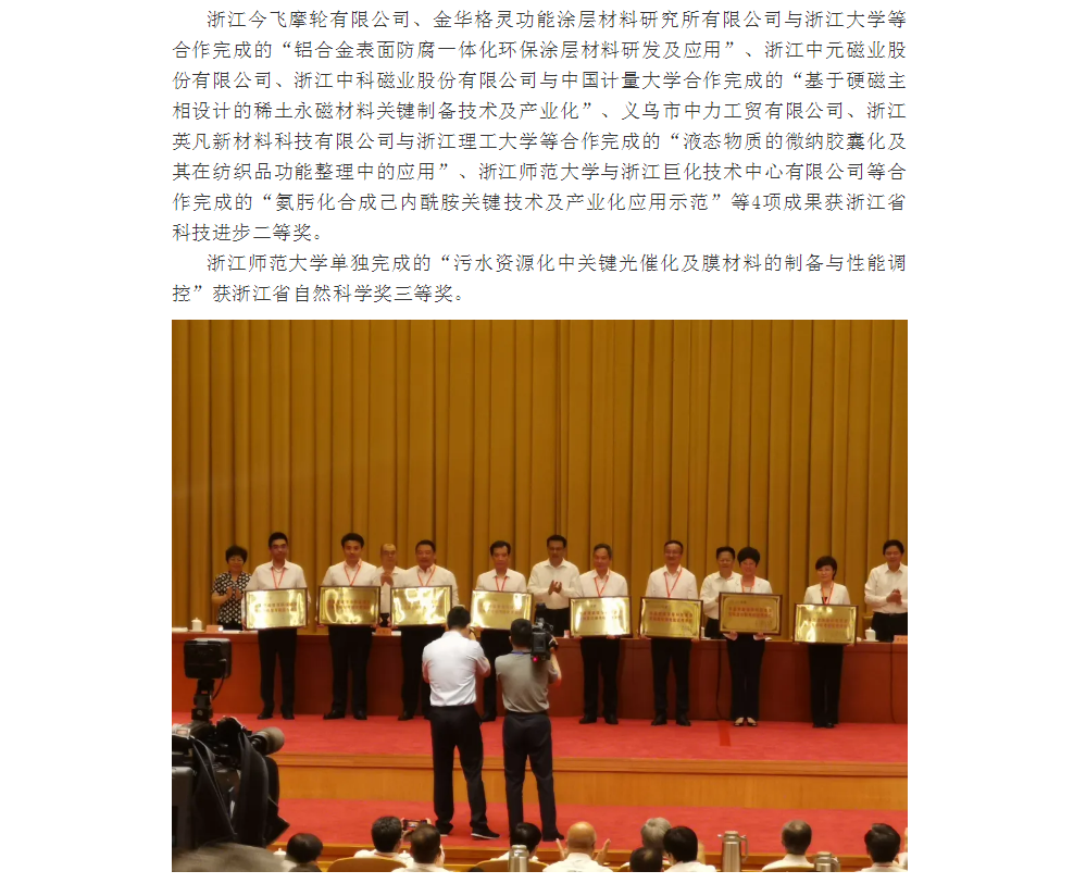 浙江萬里揚(yáng)股份有限公司牽頭與北汽福田汽車股份有限公司、金華市計(jì)量質(zhì)量科學(xué)研究院等合作完成的“商用車變速器輕量化、模塊化技術(shù)的研究及產(chǎn)品開發(fā)”、橫店集團(tuán)東磁股份有限公司單獨(dú)完成的“無線充電用高磁導(dǎo)率FS500鐵氧體片”、浙江道明光電科技有限公司與道明光學(xué)股份有限公司完成的“符合ECE R104微棱鏡型反光膜關(guān)鍵技術(shù)研發(fā)及產(chǎn)業(yè)化”、金華市中醫(yī)醫(yī)院?jiǎn)为?dú)完成的“脾腎陽虛血瘀型腎衰的理論基礎(chǔ)及腎毒寧方干預(yù)機(jī)制研究”、金華市公路與運(yùn)輸管理中心牽頭與東南大學(xué)等合作完成的“浙江省重載干線公路車轍機(jī)理與路基路面一體化防治技術(shù)”、浙江綠巨人生物技術(shù)有限公司與浙江大學(xué)等合作完成的“適宜糖尿病食用高抗性淀粉水稻種質(zhì)創(chuàng)制、機(jī)理特性及產(chǎn)業(yè)開發(fā)”、義烏市中醫(yī)醫(yī)院與浙江省立同德醫(yī)院合作完成的“丹溪學(xué)派的傳承發(fā)展與著述研究”、金華市農(nóng)業(yè)科學(xué)研究院、金華市荊龍生物科技有限公司、浙江壽仙谷醫(yī)藥股份有限公司與浙江農(nóng)林大學(xué)等合作完成的“金線蓮優(yōu)異種質(zhì)創(chuàng)新及生態(tài)栽培關(guān)鍵技術(shù)研究與應(yīng)用”、國網(wǎng)浙江省電力有限公司金華供電公司與杭州電力設(shè)備制造有限公司等合作完成的“新型開關(guān)設(shè)備態(tài)勢(shì)感知與智能運(yùn)維關(guān)鍵技術(shù)及產(chǎn)業(yè)化”、東陽市人民醫(yī)院與杭州電子科技大學(xué)等合作完成的“面向健康養(yǎng)老的人機(jī)共融智能監(jiān)陪護(hù)系統(tǒng)關(guān)鍵技術(shù)及應(yīng)用”、浙江凱文磁業(yè)有限公司與中國計(jì)量大學(xué)等合作完成的“新能源汽車用高耐熱沖擊釹鐵硼關(guān)鍵制備技術(shù)及其電機(jī)應(yīng)用”、浙江師范大學(xué)與杭州醫(yī)學(xué)院等合作完成的“基于浙江實(shí)踐的農(nóng)村衛(wèi)生發(fā)展策略研究”等12項(xiàng)成果獲浙江省科技進(jìn)步獎(jiǎng)三等獎(jiǎng)。