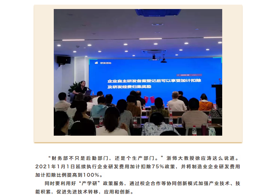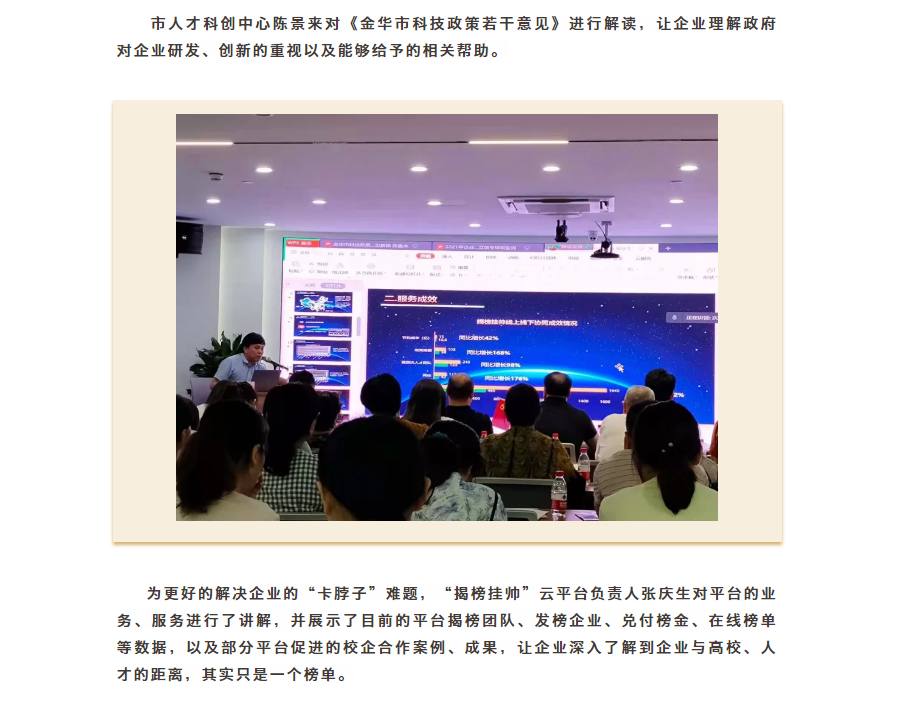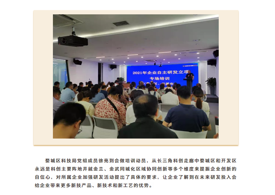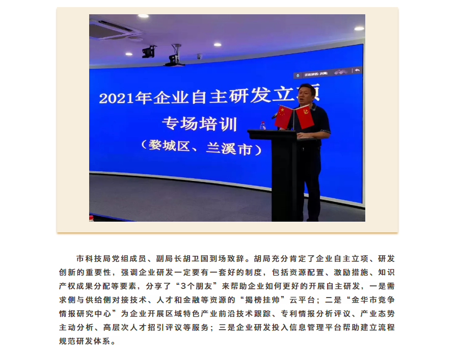 為進一步加強企業(yè)研發(fā)項目登記管理,幫助企業(yè)掌握自主研發(fā)立項的思路、方法和系統(tǒng)操作,引導(dǎo)創(chuàng)新主體加大R&D研發(fā)投入,解讀企業(yè)研發(fā)經(jīng)費加計扣除等科技政策。6月21日,在市科技局的指導(dǎo)下,市人才科創(chuàng)中心聯(lián)合婺城區(qū)和蘭溪市,組織2021年企業(yè)自主研發(fā)立項線上線下專場培訓(xùn)會在浙中科技大市場暨“揭榜掛帥”服務(wù)中心順利召開。此次參加線上、線下培訓(xùn)人員共計160人左右。浙中科技大市場和金華市高新技術(shù)企業(yè)協(xié)會具體承辦。