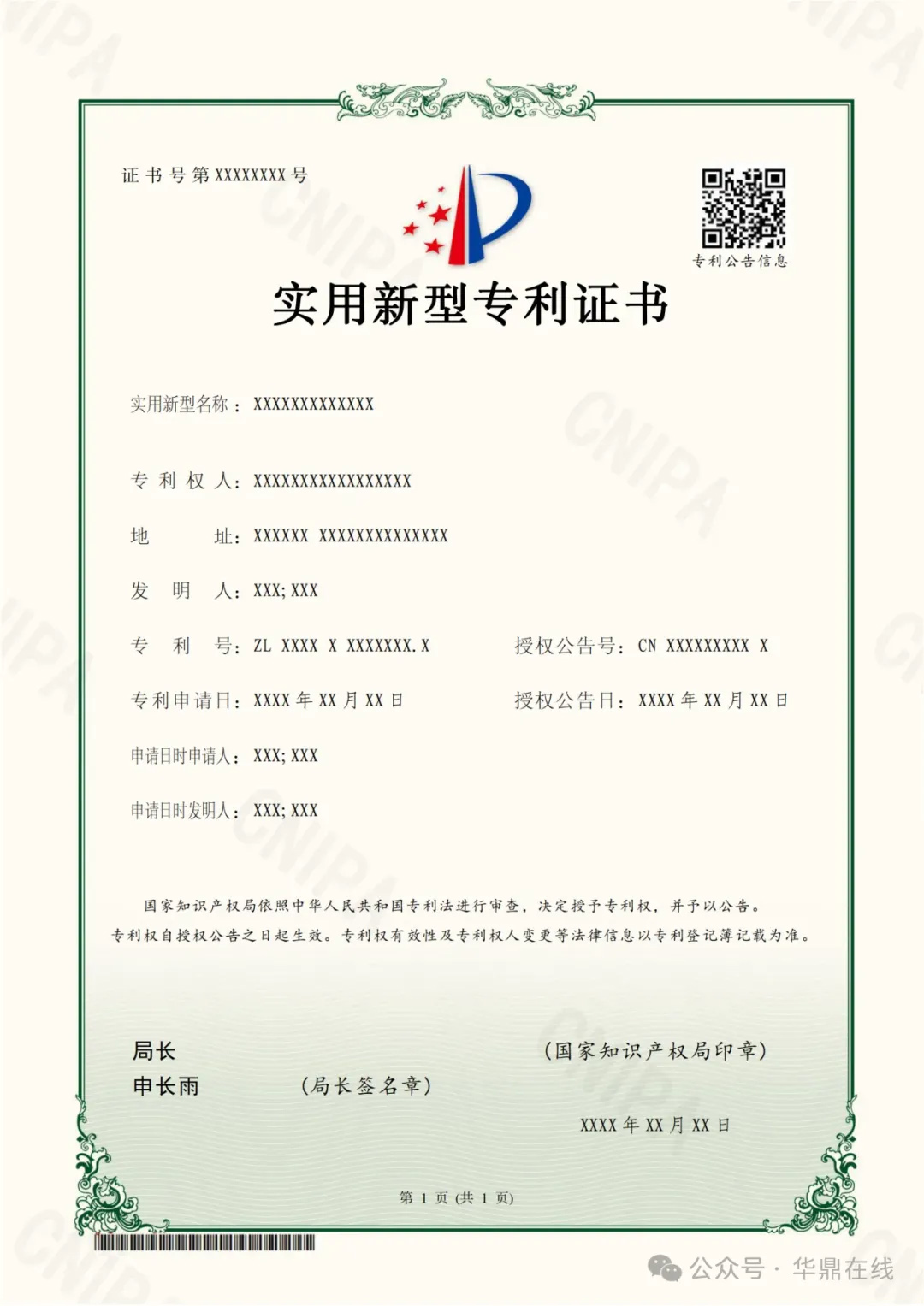 對于授權(quán)公告日在2024年6月1日之后(含當日)的專利,國家知識產(chǎn)權(quán)局頒發(fā)新版專利證書。新版專利證書沿用A4規(guī)格豎排版式,優(yōu)化調(diào)整著錄事項布局。